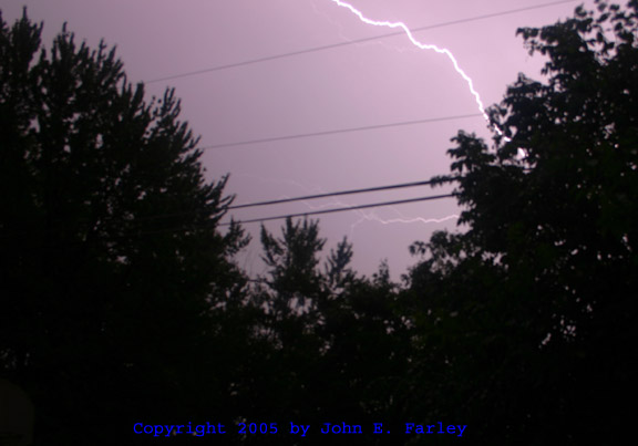 ADDED SEPTEMBER 7, 2005! Here are the fruits of my first successful effort at getting lightning on a time exposure with a digital SLR camera rather than by capturing frames from video. The lightning occurred in the late evening on August 27, 2005. I was able to get a couple decent shots of the lightning, even though the storms were about 50 miles to my south southeast.