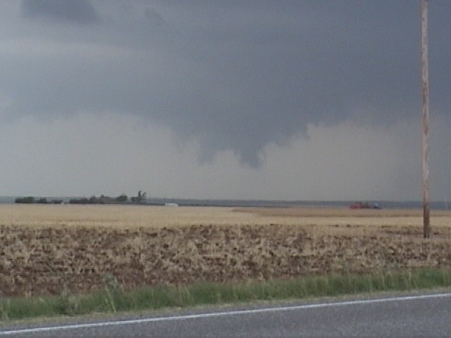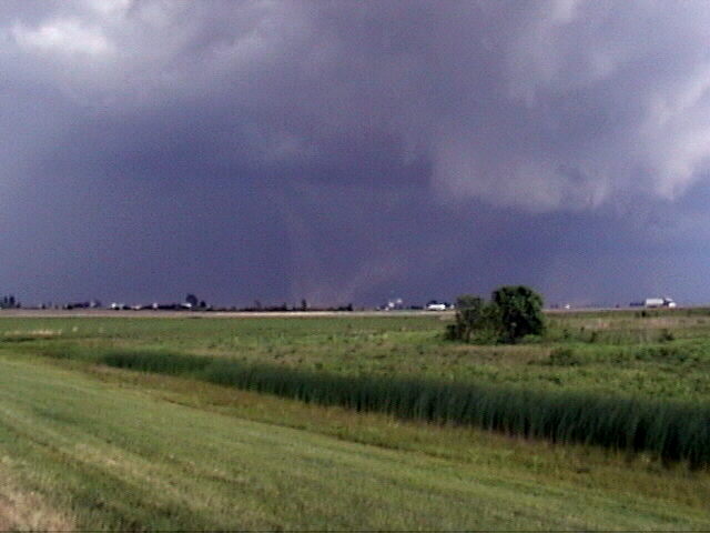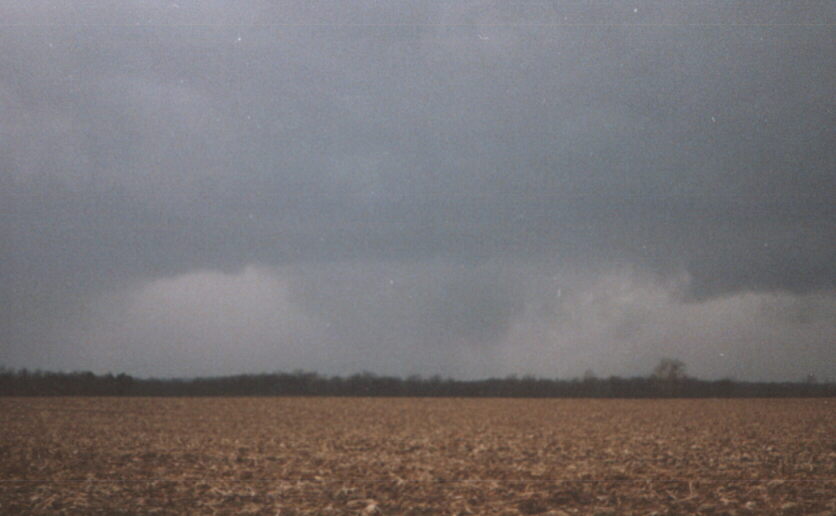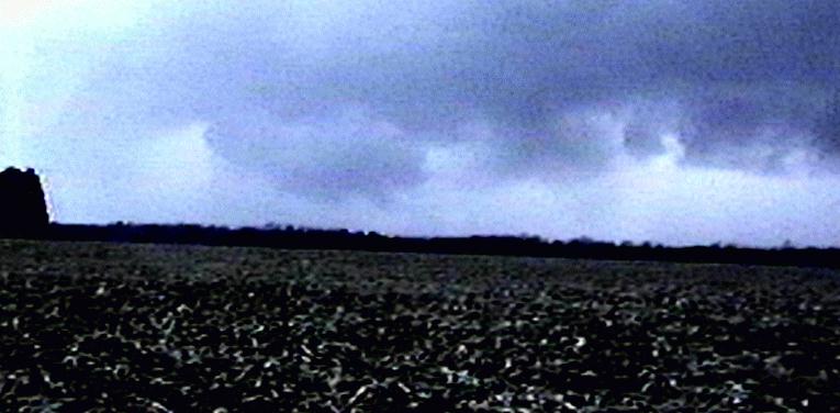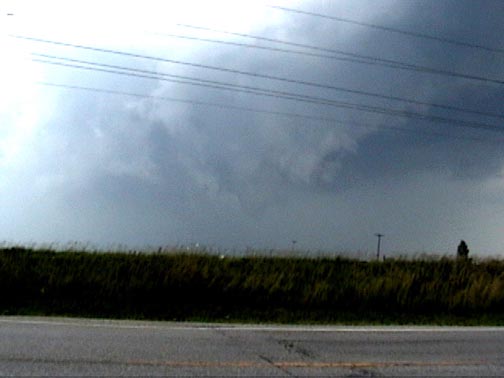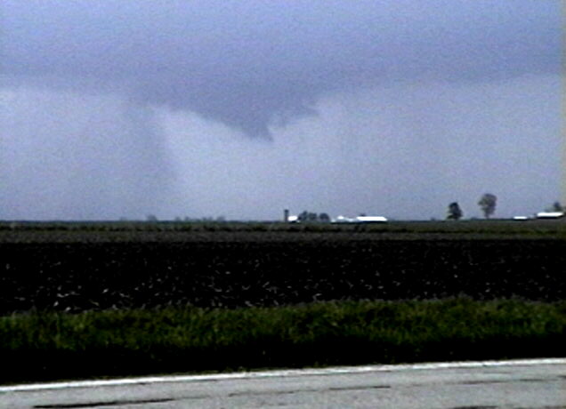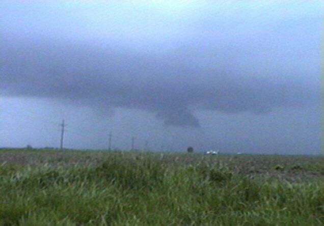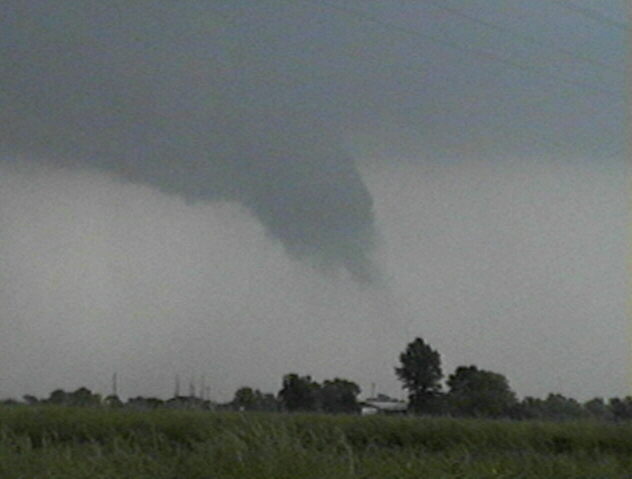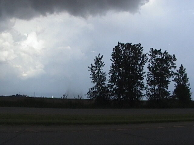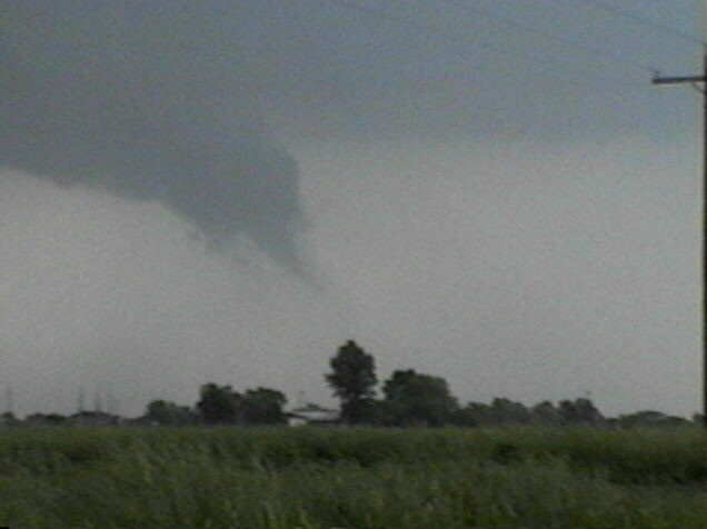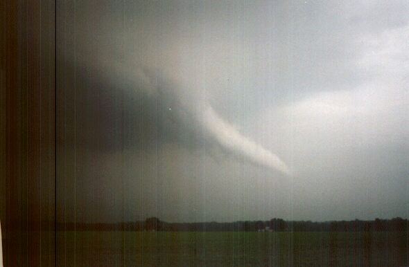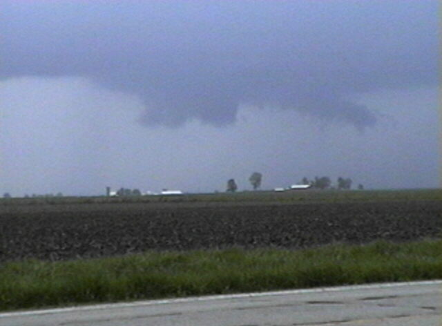 On May 28, 2003, I got about 3 and a half minutes of video of a weak tornadic circulation about 3 or 4 miles northeast of Lincoln, IL. It was on the ground for at least 2 miles and at least 7 minutes as it tracked southeast. It formed under the flanking line of a supercell that produced several other tornadoes as well as baseball hail. Both of these pictures are digital video captures; in the first, the contrast is slightly enhanced.