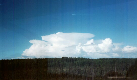 Check out this impressive overshooting top and backsheared anvil. The most unusual thing about this storm was its far northern location: I took this picture from a train between Talkeetna and Anchorage, Alaska on June 23, 2000.