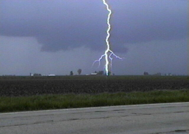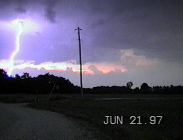 On 6/21/97 south of Terre Haute, IN, Alice and I saw a spectacular CG, less than a mile away, backlit by the setting sun. Here is a Snappy video capture of this lightning.