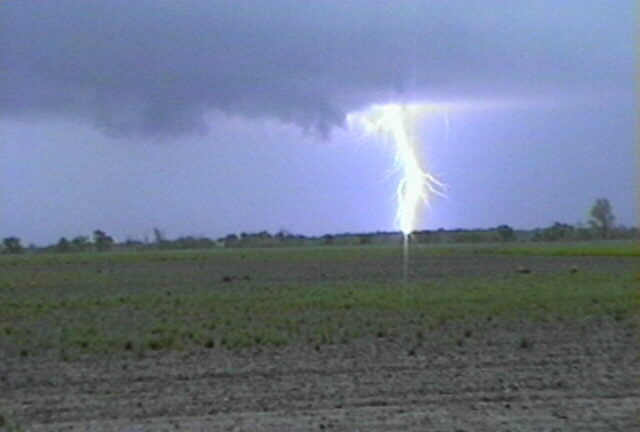 CG lightning zapped down in front of a small wall cloud on this hail-producing storm in southern Macoupin Co., IL on May 1, 1998. The storm was accompanied by frequent CG lightning.