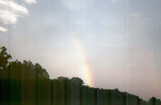 Here is a nice rainbow in a sunlint rainshaft on July 13, 2004 near Lake Shelbyville, IL. I missed this day's giant hail and tornadoes, but did get a couple nice cloud and rainbow pictures.