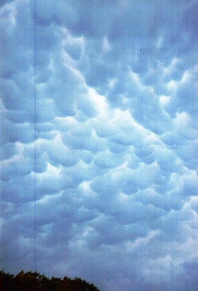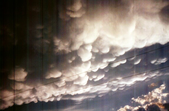 I photographed these mammatus clouds on the underside of a supercell's anvil over Leech Lake, MN July 20, 1998. Although the storm produced only a light thundershower at my location, it produced 3 tornadoes and several reports of wind damage in a line from NW of Detroit Lakes, MN to just north of Brainerd, MN.