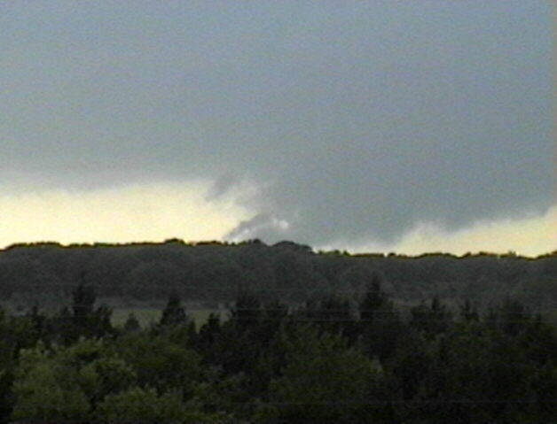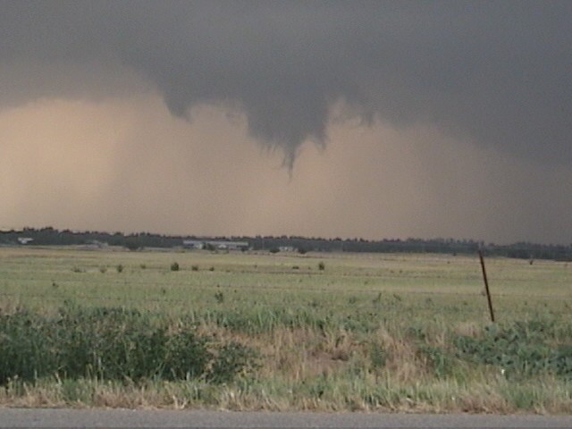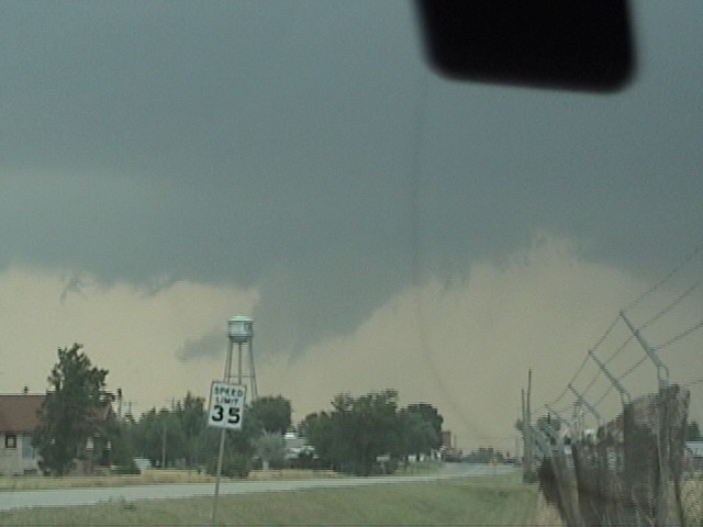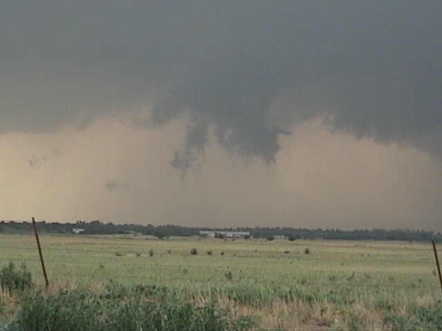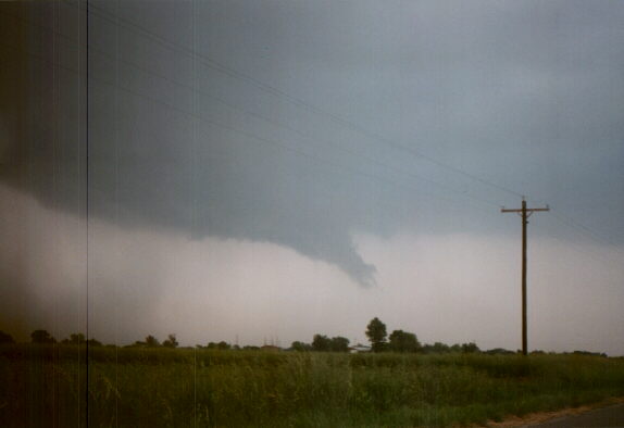I got some low-contrast video of a tornado near Cordell, OK on May 5, 2001. The tornado can be seen above the sloping part of the white roof between two poles. The tornado is generally lighter in color than the background behind it, though a bit darker along the left edge. Here is an enhanced version of the video capture - it's more grainy, but the tornado is easier to see. Although the bottom of the condensation funnel is hidden by the building, the condensation never did go all the way to the ground - but the circulation did, for 4-6 minutes. People east of the storm got high-contrast pictures of the purplish tornado. The tornado apparently dissipated for a minute or two, then re-formed. This happened as I was trying to get out of town to get a better view; when I did, I was able to get a video capture of this feature; note what appears to be a pinkish funnel protruding in front of darker cloud base as the sun front-lit it. I think, in comparing to reports of other observers, that this was the re-formation of the tornado, but I am not sure. The tornado came from a spectacular storm that produced a nice beavertail and some interesting lowerings like this one and this one, along with low-level rotation for a long time before producing the tornado. The storm started out somewhat high-based and low-topped in its early stages, but after a couple hours it intensified rapidly, producing this partially rain-wrapped wall cloud then the tornado a few minutes later.