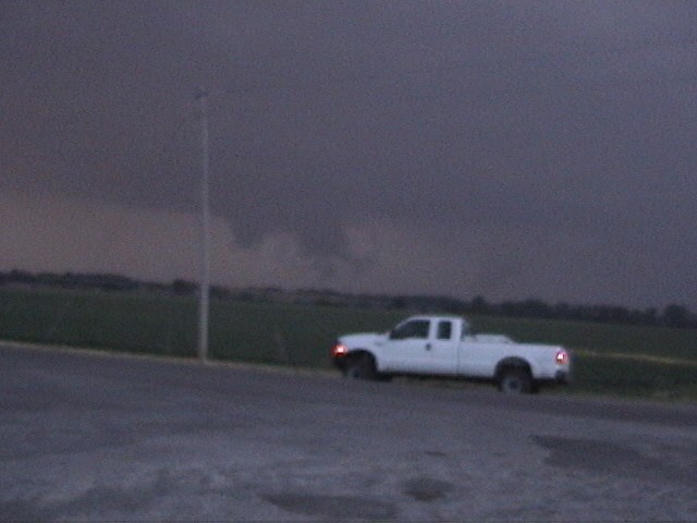 ADDED JUNE 21, 2005! On June 13, 2005, I observed a tornadic supercell, which also produced up to golfball hail, over Jersey and Macoupin Counties, IL. The storm had a spectacular wall cloud, as well as this apparent funnel cloud near Medora, IL (video capture, contrast slightly enhanced). Just before this, it also produced an F0 tornado 2.5 miles north of Brighton, IL with a half-mile damage track. However, and unexpectedly, the tornado occurred not with the main mesocyclone/wall cloud, but about four miles south of it. Here is a video capture of the cloud feature associated with the tornado, taken around the time the tornado ended. Later, over western Macoupin County, the mesocyclone intensified again, with roation visible at the time this photo was taken.On May 29, 2004, I witnessed a monstrous tornadic supercell that eventually moved all the way across Oklahoma. The storm produced several tornadoes, mostly low-contrast and often rain-wrapped. This video capture, enhanced due to the low contrast, shows an area that contained a rain-wrapped F2 tornado, SE of Thomas and west of Geary. The actual lowerings here, though, are probably cloud tags on the outer perimeter of the meso, not the actual tornado. I also saw anti-cyclonic rotation with what may have been the second or third of three tornadoes that occurred northeast of Calumet. This picture shows a brief needle funnel associated with the anti-cyclonic rotation, and in this video capture, taken a couple minutes earlier, the intense anticyclonic circulation could be seen, though there was no condensation funnel at this time. Earlier, the storm produced giant hail near Thomas. I saw stones over 4 inches in diameter, though this 2.5 inch stone is the biggest I got a good picture of. I also saw another possible tornado and at least 2 funnel clouds I did not manage to get pictures of. The storm produced other interesting lowerings, like this one and this one. And the lowering shown just behind the cab of the truck here may or may not have been a rain-wrapped tornado that occurred around sunset near Piedmont, OK.