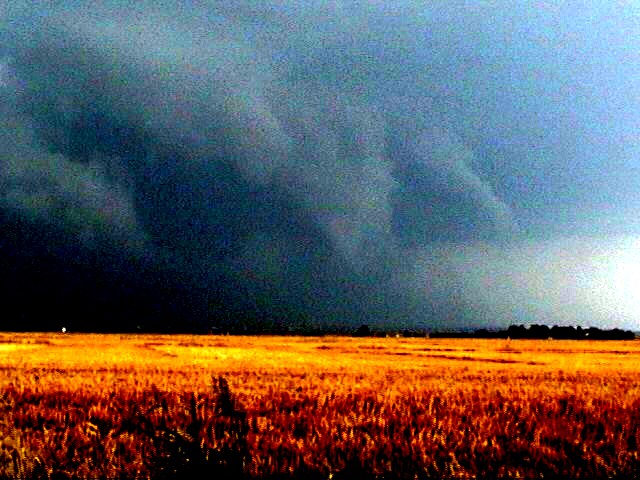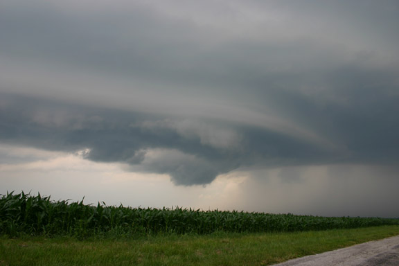 On June 4, 2002, I photographed a spectacular shelf cloud between Eureka and Bloomington, IL. I repeatedly stopped to film the shelf cloud, then had to quickly flee as the storm approached. Spectacular! This storm produced gusts to 65 mph causing wind damage in several locations and hail up to 2 inches in diameter. It also produced a huge, wide dust plume most of the way up to the cloud base under shelf cloud to SSW. It looks like something you would see in Oklahoma or Colorado, not Illinois! A bit closer to me, the shelf cloud showed a sharp linear striation where it intersected with the parent cloud. I get a little more video of the spectacular, menacing shelf cloud as the storm is about to overrun me for the second or third time.