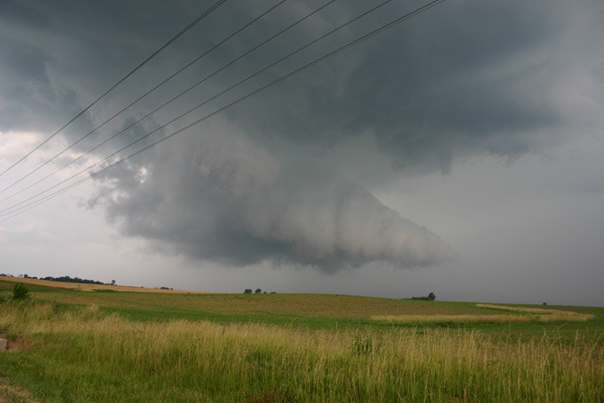 The evening of June 14 - the same day a destructive bow echo storm had caused widespread damage throughout the northern part of the St. Louis area - this tornadic supercell moved just north of the St. Louis area, producing a damaging tornado in the New Douglas/Sorento, IL area. I took this picture around the time of the tornado - note the overshooting top. Also very evident was a rear flank downdraft slot. The storm was about 12 miles away when I took this picture.