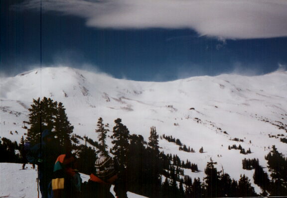 Speaking of snow, look at this picture of blowing snow on the crest of the Continental Divide at the Loveland, Colorado ski area in March, 1997. A few minutes after this picture was taken, a gust of 80 mph was recorded at the top of one of the chairlifts. Later, two chairlifts were closed when winds gusted to 90 mph. Above the blowing snow is a nice example of a lenticular cloud.