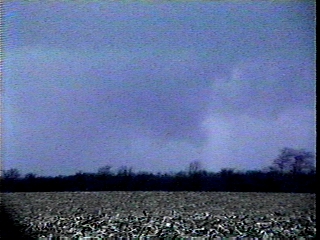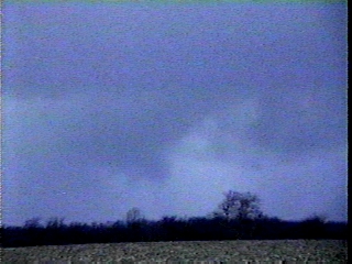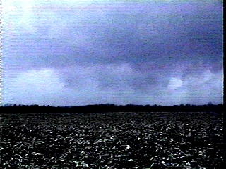 Here are some video snaps of a tornadic storm in Macoupin County, IL May 12, 1998. Here is a large wall cloud with inflow tail northwest of Palmyra, IL (large file - may take a couple minutes to load - not converted to condensed jpeg due to low contrast). About 30 minutes later this lowering produced a tornado about 3 miles east of Palmyra, but a few minutes after the picture above it became obscured by rain so I did not see the tornado. Around the same time as this first lowering I also saw some beautifully sunlit and knuckled anvil from another storm to the southwest. A few minutes later and at a location a little to the southwest I saw this solid lowering that briefly looked like a funnel - but I could see little or no rotation. Then, it evolved into a more typical-looking wall cloud. This was located just southwest of Palmyra. Finally, on the way home I saw an apparent rain-wrapped funnel, located about midway in time and space between the two tornado touchdowns this storm produced. Video snaps of this feature and further explanation can be found here.