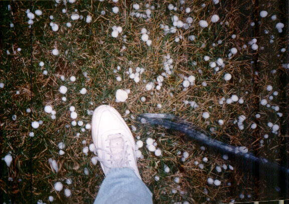 On February 27, 1999, a supercell moved through the St. Louis area producing over $16 million in hail damage and a brief tornado just north of Troy, IL. Here is a video snap of dime to nickel size hail pelting my barbecue deck, and here is a photo of hail up to golfball size still on the ground 20-30 minutes after the storm passed Illinois route 4 between Troy and St. Jacob. Parts of St. Louis got hial up to 2.5 inches in diameter.