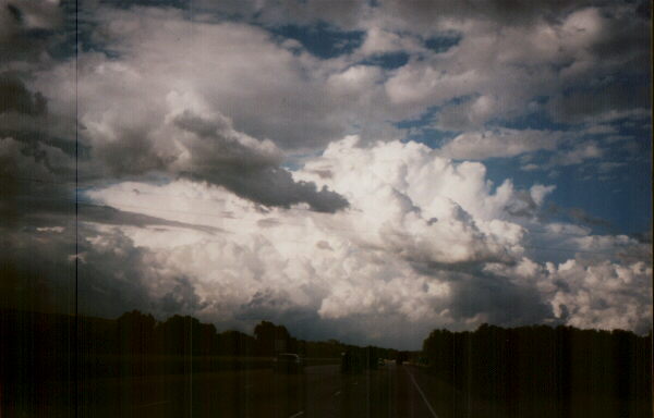 On June 6, 1997, Alice and I saw this spectacular cloud lowering on a storm in eastern Madison County, IL, near New Douglas. The lowering widened. It formed on the southeast edge of a wall cloud we had been watching for about half an hour, when a newly developing precipitation shaft on its rear flank merged with a weakening one on its front flank, creating an interaction zone between inflow and outflow. Cloud motion was clearly rising, but rotation, if any, was slow and weak so far as we could observe or see from the video. A short time later, I photographed this beautiful towering cumulus from the I-70 rest area near Highland. This developed into a storm merged with another to its south to produce large hail and wind damage in southeast St. Clair County. At the same time, a new storm developed northeast of Edwardsville and northwest of Marine, giving us a chance to photograph its brightly sunlit top through an opening in the dark clouds at its base. It, too, produced a wall cloud, as well as a lighting strike that sent smoke or steam rising from a field about 200 feet from our car as we drove past the field (sorry, no picture of this!). I did, however, get another good picture of the wall cloud.