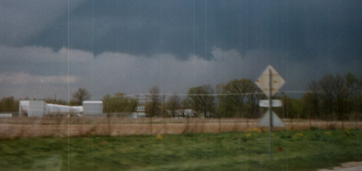 On April 30, 1997, a severe weather outbreak occurred in Illinois. I photographed these cloud lowerings, including a couple possible brief small funnels, in a severe storm in Macoupin County that prompted a tornado warning and produced 1-inch hail near Carlinville. A wide-angle version of this photo showing storm structure can be seen here. Shortly thereafter, this tornadic supercell developed about 10 to 12 miles to my east, and as it moved rapidly northeast it produced twin tornadoes near the Montgomery-Christian county line. The dust in the foreground is from high winds behind the cold front that caused the storms. Soon, I was in a dust storm myself.