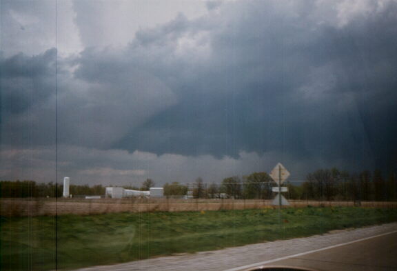 Chasing in a carvan with the ILCHASE gang (Mark Siefried, Scott Kampas, and Chris Novy) and with Blake Naftel in southern Illinois on April 21, 2002, I saw this large wall cloud and beavertail near Benton, IL. Chris Novy directed us toward a road to follow the storm as I got this shot of the wall cloud (video captures). I was also fortunate to get this this snapshot of the wall cloud and beavertail out the window of my car as we pursued the storm.
