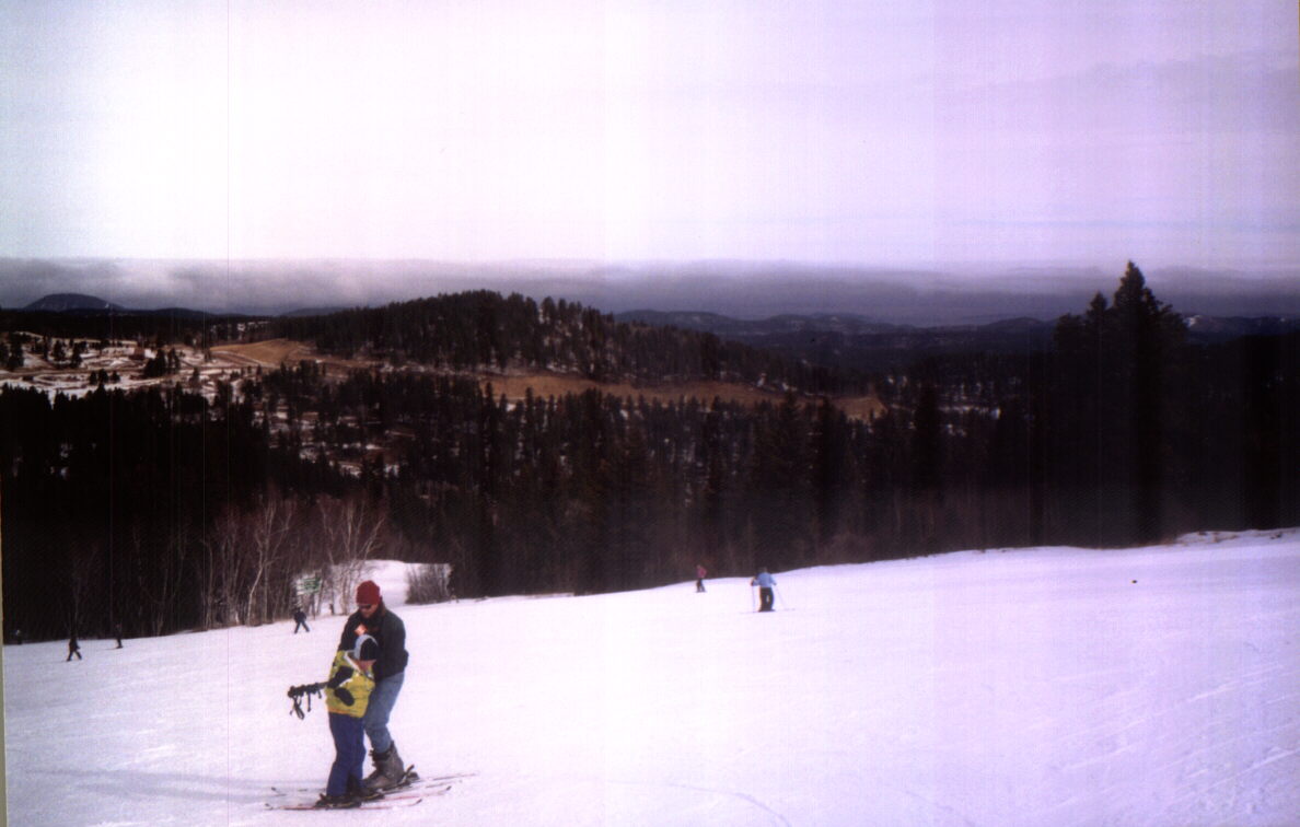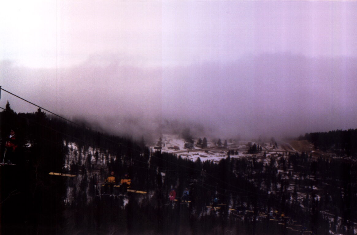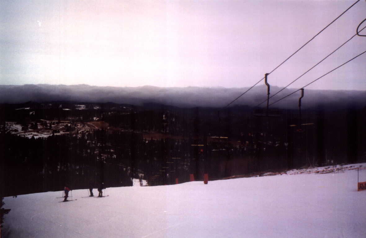 While skiing at South Dakota's Terry Peak on February 23, 2002, I observed the passage of a strong cold front that plunged temperatures from the 50s and 60s to well below freezing there and in much of the midwest. The front was clearly marked by a deck of low clouds and fog, seen here in the distance, then coming closer, and finally moving over the next ridge toward the ski area. Within a half hour or so of the latest photo, it enveloped the ski area in fog, and the temperature plunged.