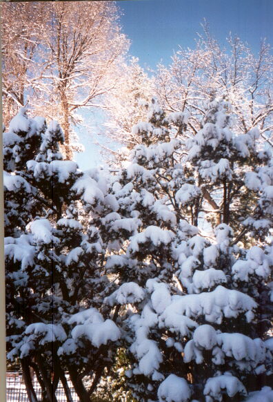 Here is a photo I took on March 13, 1999 of freshly fallen snow clinging to trees in Santa Fe, NM, brightly lit by the morning sun.