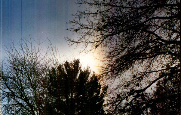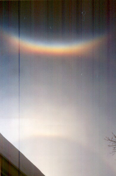 A visual treat of winter weather in the colder parts of the U.S. can be found in the displays of sundogs and sun halos that sometimes occur. This sundog was part of a brilliant display that occurred in Waterloo, Iowa on December 21, 2000. The temperature was low, and ice crystals in the air near the ground led led to the brilliant display as they refracted light from the early morning sun (and again near sunset that day). This feature looks like a rainbow, but note that it is in a clear sky (and the temperature was way too low for rain). Apparently, this is a feature known as a circumzenithal arc. This feature seemed to appear where an outer (i.e. 46-degree) sun halo overlapped with its mirror image. Note that near the bottom of the picture, you can see the primary (inner, or 22-degree) sun halo. Sundogs form on this inner halo, at points horizontal from the sun to its right and left, and in fact the sundog shown earlier was on the right-hand side of this halo. An excellent Web resource on sun halos and sundogs, including such less common phenomena as circumzenithal arcs and 46-degree halos, can be found here. Thanks to Geoff Lewen for bringing this Web site to my attention.