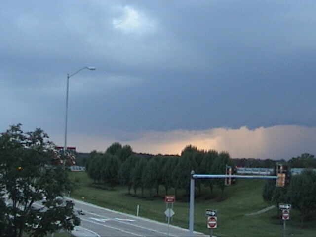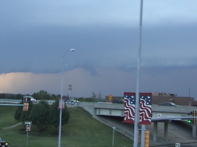 Always have a camera handy! I got this picture, one of my best storm structure shots ever, through the windshield of an airport limo! Note that the entire storm is included in the photo, including a brightly sunlit wall cloud that was in just the right place for the sun to shine on it through the RFD notch. As we got closer, we could see definite rotation, but the storm was already starting to weaken and the lowering dissipated about 15 minutes after this picture was taken. Although it looks like a tornado in the picture, the rotation apparently did not extend to the ground and no tornado or wind damage was reported with this storm. This picture was taken June 24, 2000 from near the intersection of I-255 and I-270 in Madison Co., IL, around 7:45 p.m. Earlier the same day, a tornado did cause considerable damage near Mascoutah and Millstadt, IL, about 30 miles south of this location.