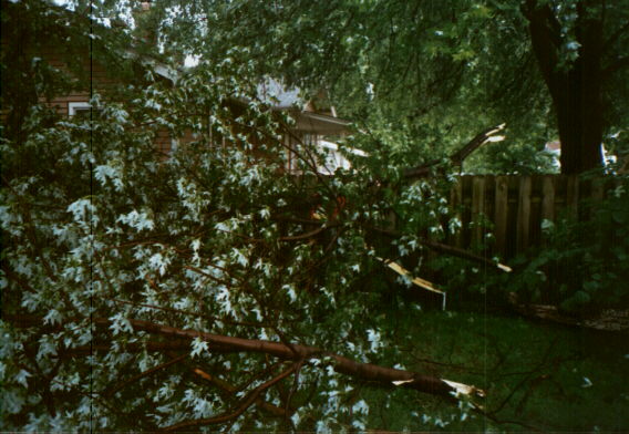 In May, 1996, a microburst in a severe thunderstorm produced winds of 70-90 mph in Edwardsville, producing damage throughout the southern and eastern part of town. This is what my backyard looked like after that storm.