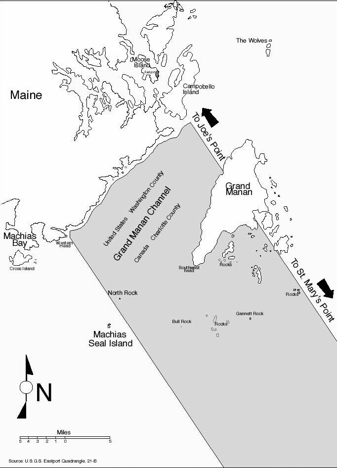 The key stumbling block to whether the Machias Seal Island was included in the Province of Nova Scotia lies in the vague and imprecise wording of this grant itself, and is essentially two fold in nature. As illustrated earlier, either of two different boundary lines could be utilized to pivot the boundary one way or another in favor of that parties claim. This situation exists because the United States and Canada have never bilaterally agreed upon their own set of baselines.Baselines, straight lines drawn from point to point along an irregular coastline, are used to help delimit where a countries territorial waters should be defined. The other problem interpreting this grant lies in the term "near to," which appears with the six league limitation. This phrase is so vague and subjective that a quantitative definition is obviously indefinable. It can be easily argued that these two words alone have created the entire problem regarding the sovereignty over Machias Seal Island. Either side could claim that the island is or isn’t "near to" the boundary, and so should or shouldn’t be included as part of the claim.