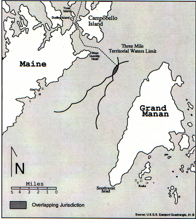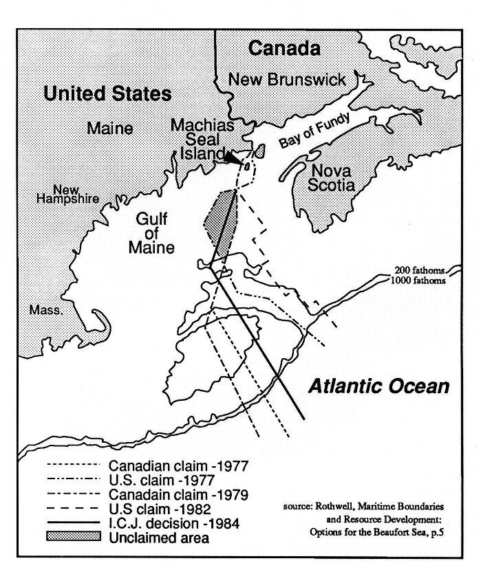 The United States itself has numerous boundary disputes over its territorial possessions with many countries around the world. Closer to home theand despite the amicable and co-operative political relationship between the US and Canada, all four of the shared oceanic boundaries are in some degree of contention. These boundaries dictate control over the rich fishing grounds and other natural resources of the continental shelf. The boundary through the Gulf of Maine at Machias Seal Island has never been officially defined, let alone delimited in any bilateral agreement due simply to the existence of this territory under dispute.This dispute actually could have been settled in the World Court's 1984 delimitation decision that divided up the rich fishing grounds on George's Bank.However, Machias Seal Island was deliberately left out of consideration because neither side was willing to have its interests invalidated. States are rarely willing to simply relinquish terra firma, even when no economic, political, or strategic benefit can be derived. Such acquiescence could obviously be viewed as weak and contrary to national interests by either the international community or constituents at home.Hence, Machias Seal Island is in the midst of a gap in the boundary line.