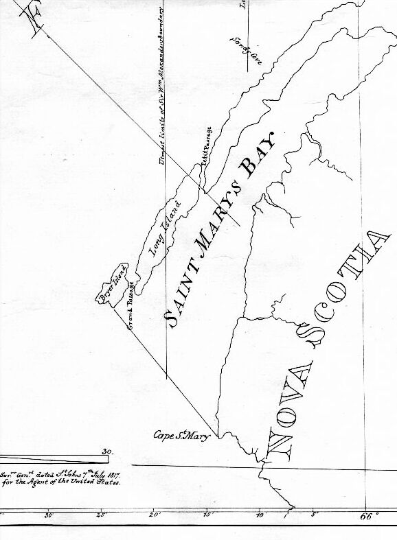 Canada asserts it gained ownership through this early grant because a line drawn from Whipple Point, on Briar Island (which encloses St. Mary's Bay) to Joe's Point, in Passamaquoddy Bay, would include Machias Seal Island within the six league clause. The United States likewise believes that it gained ownership over Machias Seal Island because a line drawn from Cape St. Mary's, Nova Scotia to Joe's Point, New Brunswick would just barely exclude the island from the six league clause. Because it is excluded from Nova Scotia it would therefore belong to the United States because of the twenty leagues clause, noted earlier, in the Treaty of Peace. It should be noted that early arguments of the United States actually tried to use the mainland terminus of the western arm of St. Mary's Bay as the start of the boundary line across the Bay of Fundy as can be seen on the original submission, and ignore the logical end of St. Mary's Bay at the end of the large islands that clearly contain the Bay's west shore for another twelve miles.
