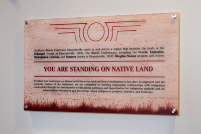 Land Acknowledgement is really People Acknowledgement – to remind us that Native Americans have been here for many thousands of years, and that they are still here. To give greater visibility to SIUE’s Land Acknowledgement statement and the peoples we hope to honor, we have created a display that will showcase art pieces from Native artists; this display can be found at the north entrance of the Morris University Center.