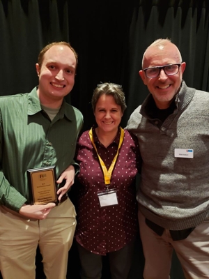 Photo: SIUE IRIS Center Technician Ben Ostermeier (left) and Illinois Humanities Program Manager for Grants and Evaluation Mark Hallett (right) accepted a 2019 Best Practices Award from Illinois Association of Museums President Karen Everingham for their Forgotten Illinois 200 project.
