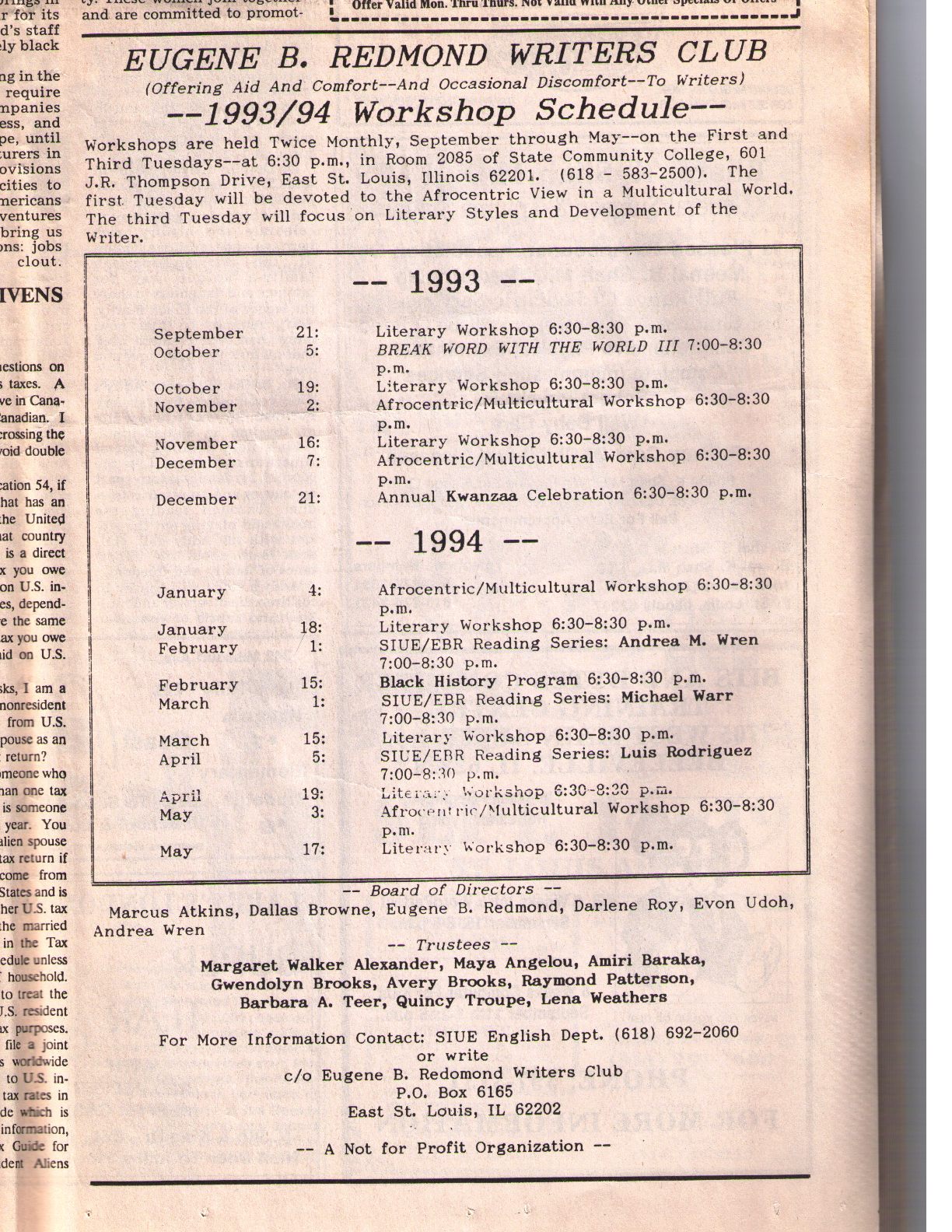 East St. Louis Poet Laureate and SIUE professor, Eugene Redmond, formed the Eugene Redmond Writers club in March of 1986. Its charter members included Sherman Fowler, Michael Fontaine, Darlene Roy. According to the group's website, "While tutoring--and giving exposure to--writers, the group also produces cultural-literary events, like Pre-Kwanzaa and "Fresh & Ancestral," for the community. In addition, it "souljourns" to conferences and festivals in the US and abroad, and collaborates with SIUE's English Department in publishing Drumvoices Revue, Break Word with the World, and anthologies of student writings."