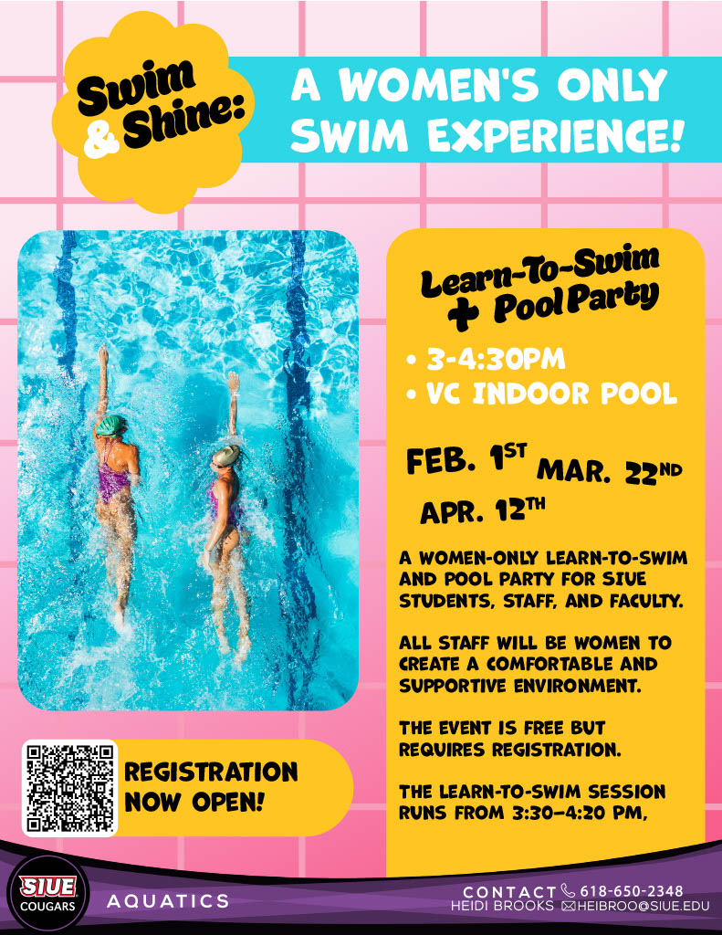 A learn-to-swim experience for women hosted by an all-female staff. The goal of this event is to provide a welcoming and supportive environment for individuals who may not feel comfortable swimming or being in the pool in a co-ed setting. Overall, this is supposed to be a calm and enjoyable learning experience for all female SIUE students, staff, and faculty. Registration is required to attend, but the event is free.
