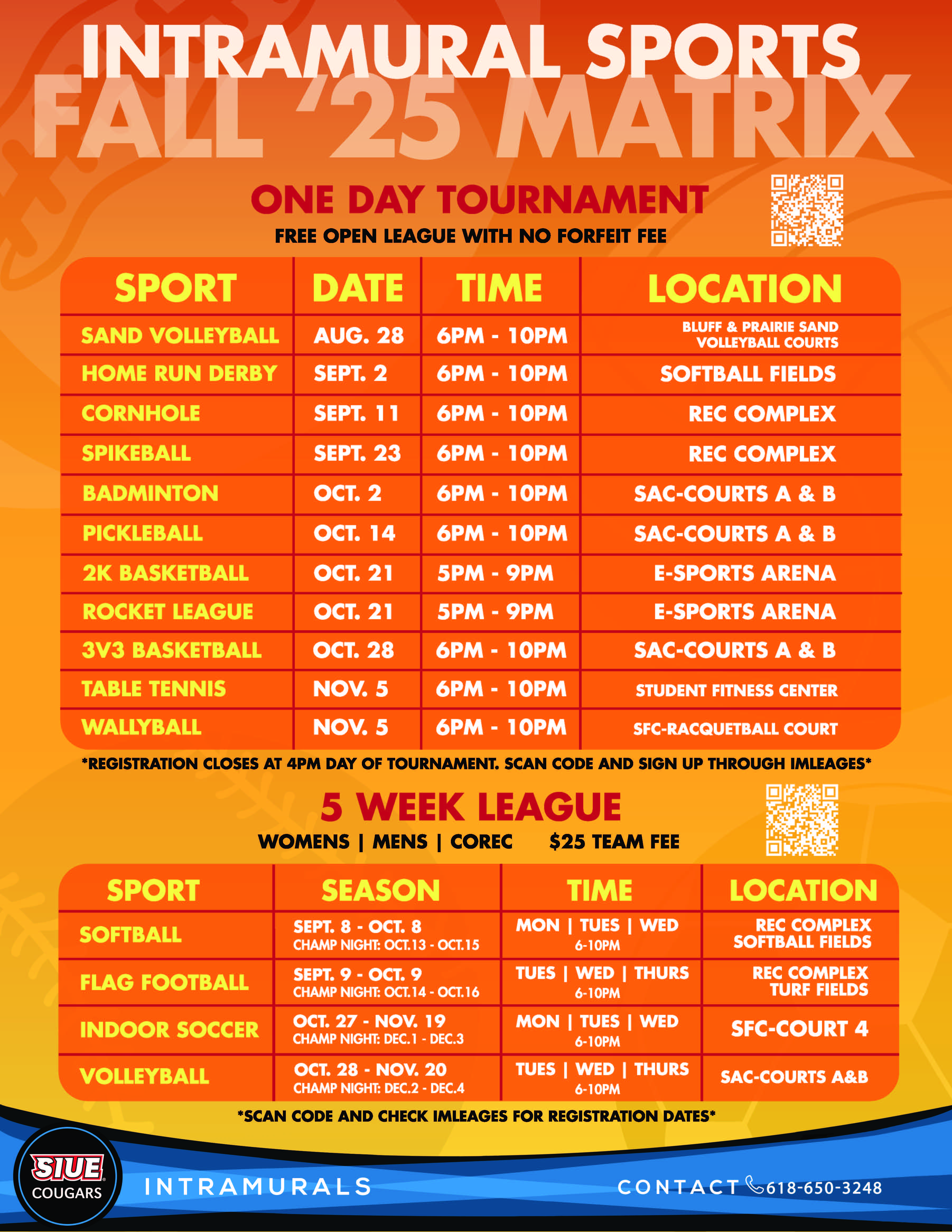 - If you are a free agent looking for a team, contact the Intramural Office at (618) 650-3274.