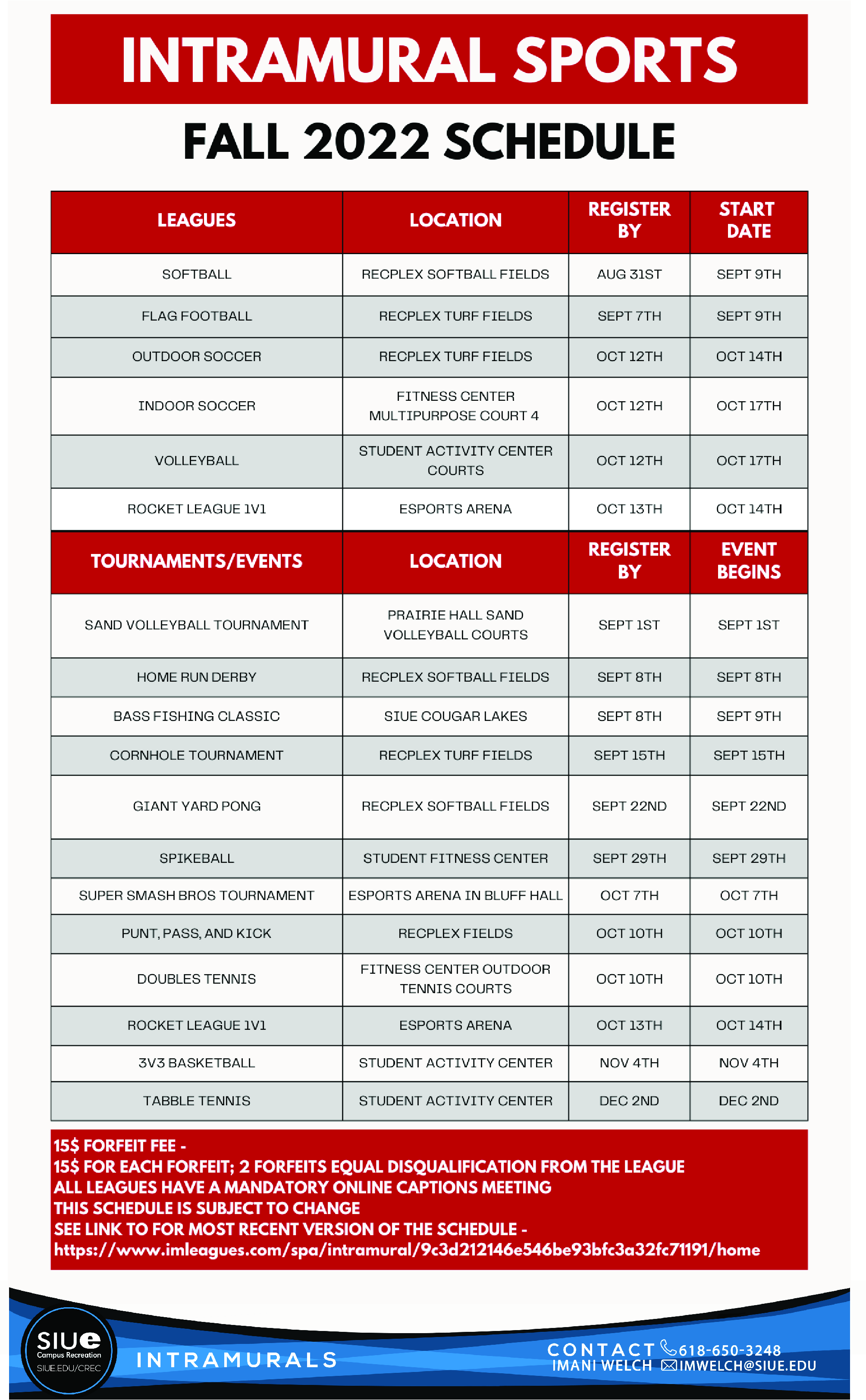 Note: All captains meetings are held online via www.Imleagues.com/siue You must watch the presentation and pass the online captains quiz.