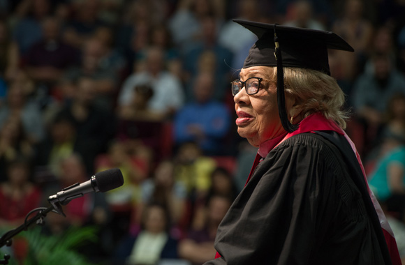 The 94-year-old Haley proudly represented five generations of college graduates from her family. In an inspirational address that routinely drew applause and affirmation, she provided sound lifetime advice to the entire crowd.