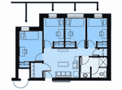 In this apartment, there are four bedrooms. Two bedrooms are private bedrooms. The other two bedrooms are shared bedrooms, meaning that there are two beds in one bedroom where two students are assigned. There are two bathrooms in the apartment for the six students to share (three students to a bathroom). The common living space has a full kitchen and living room. The kitchen has an electric stove, oven, sink, refrigerator, cabinets, and table with six chairs. The living room has a couch, four lounge chairs, and a side table. A max of six students can live in this apartment.