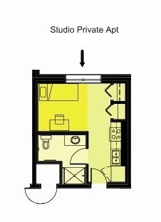 This apartment is for one single student. The one room of the apartment has an extra-long twin bed, lounge chair, desk/chair, closet, and a small kitchen area. The kitchen has an electric stove, oven, sink, refrigerator, and cabinets. Inside the apartment is a bathroom for one student. A max of one student can live in this apartment.