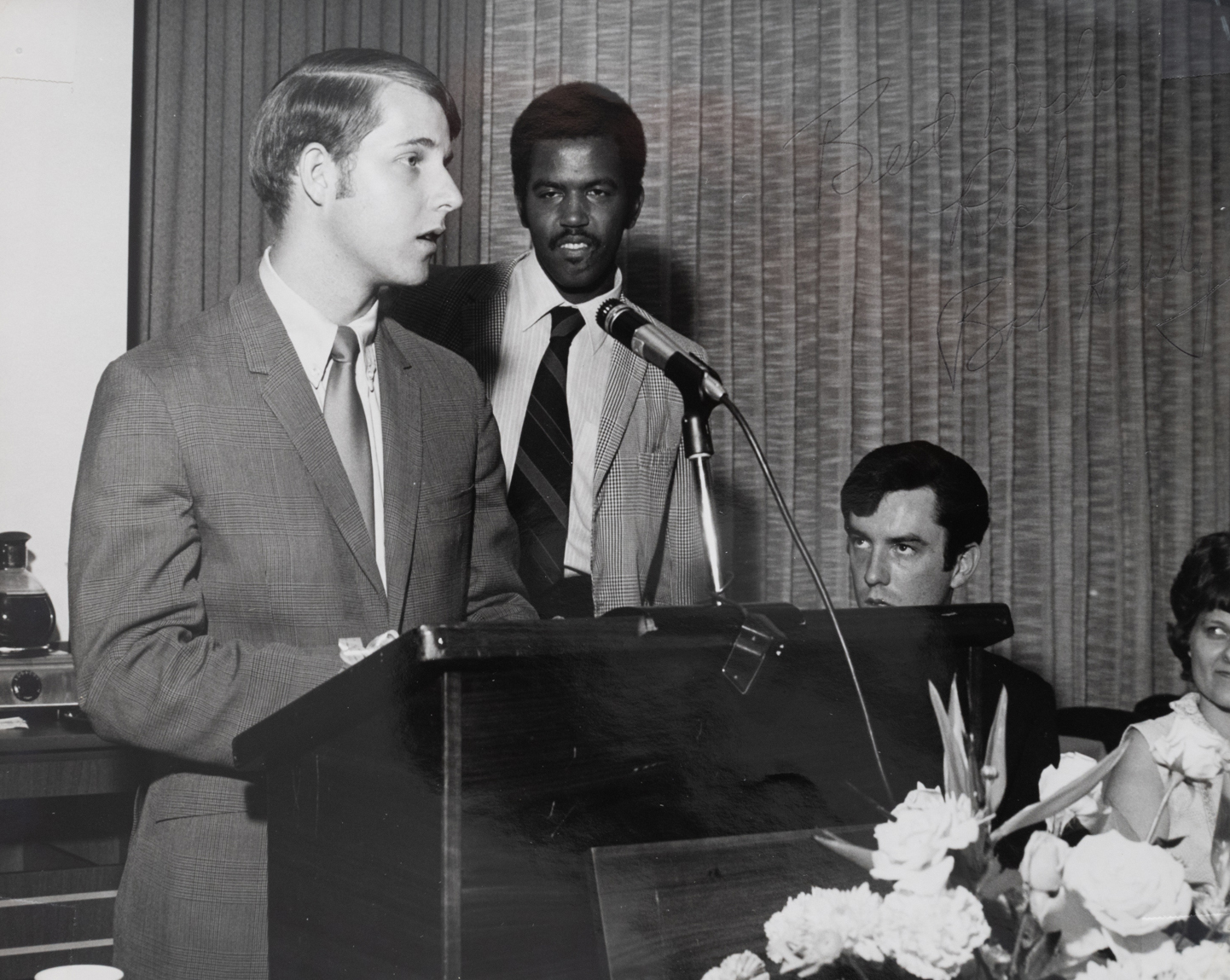 Ric Stevenson speaking as the president of the University Center Board, with past UC president, Judge Milton Wharton looking in 1969