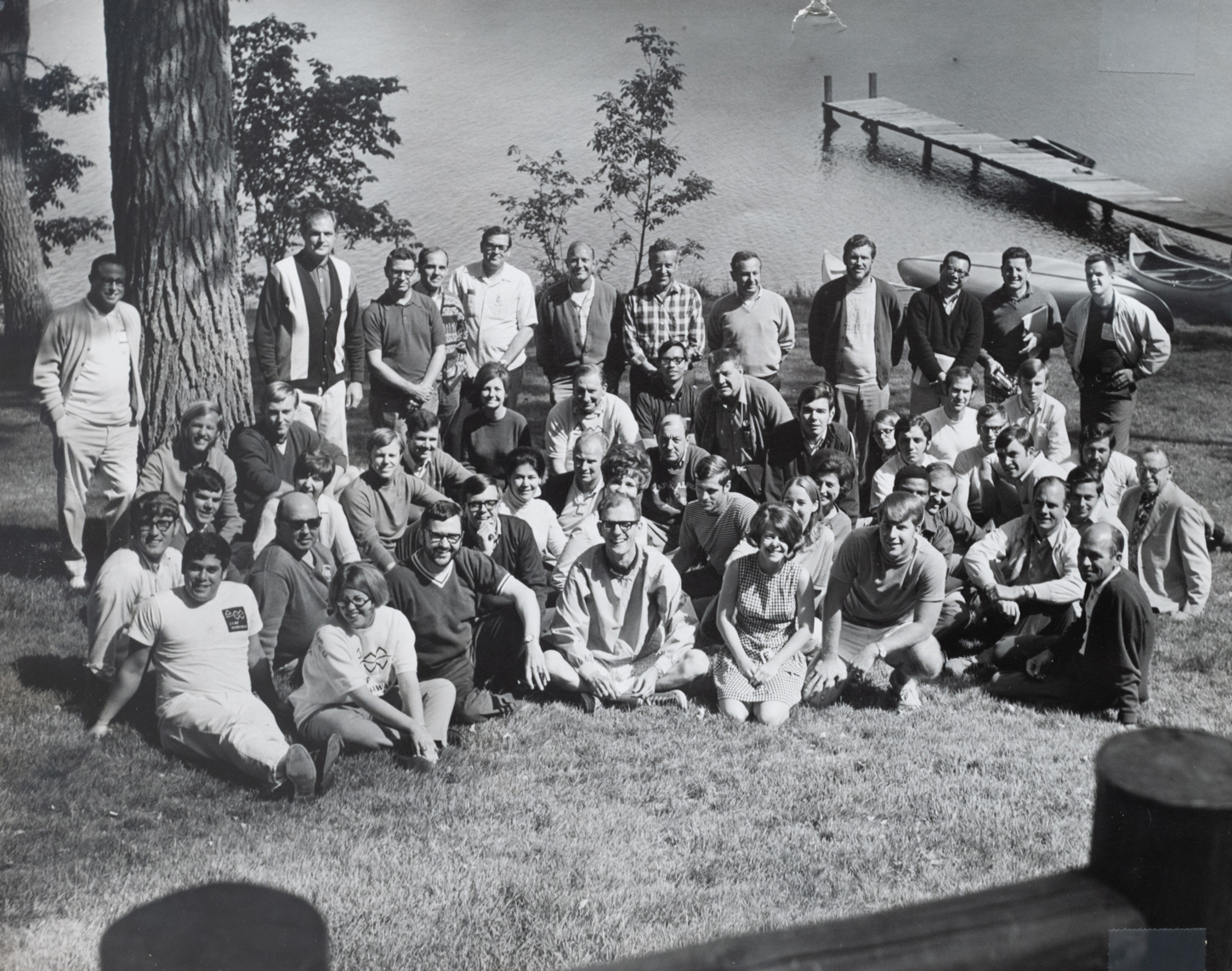 Group photo of attendees at Association of College Unions International Camp Mishawaka Retreat, 1969