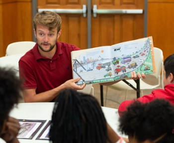 Josh Clark, a senior majoring in elementary education, reads Marvelous Cornelius: Hurricane Katrina and the Spirit of New Orleans by Phil Bildner to a group of 9-12-year-olds.
