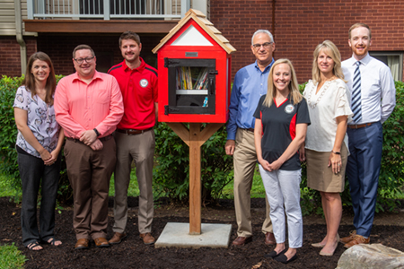 Among those involved in the Little Free Library’s donation and installation are (L-R) University Housing Interim Director Mallory Sidarous, Associate Director of Residence Life Rex Jackson, Alumni Association Board Member Ryan Downey, Former University Housing Director Michael Schultz, Alumni Association President Eileen Martindale, Director of Constituent Relations and Special Projects Cathy Taylor, and Assistant Director of Constituent Relations Nick Niemerg.