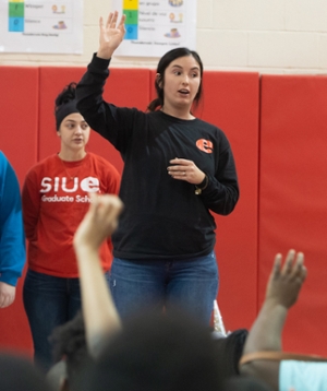 SIUE students and James Avant Elementary teachers quizzed the elementary students on the descriptions of fruits and vegetables by playing a game. When holding a picture of a certain fruit or vegetable, the person had to guess its name by asking the audience questions.