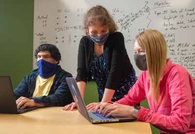 C-PAN Director Carrie Butts-Wilmsmeyer (center) mentors DSI students Courtney Flach (right) and Elijah Florence (left) as they work on data analyses.