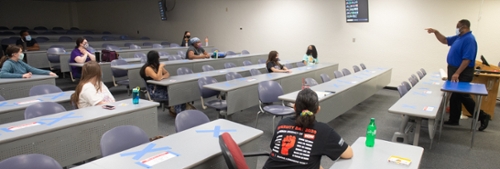 SIUE East St. Louis Center (ESLC) Executive Director Timothy Staples, EdD, talks leadership qualities with ESLC Collinsville’s Upward Bound Scholars.