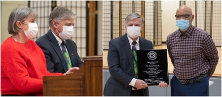 (L-R): Mary Jo and Chancellor Randy Pembrook give their rendition of “Jingle Bells” on the piano. The chancellor receives an award in honor of his upcoming retirement and longstanding supports of the arts and arts education from Performing Arts Director Homer Simmons.