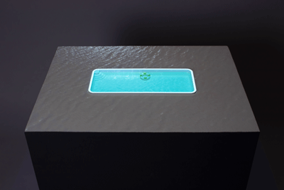 “Guise uses the concept of hyperreality, which depicts either a distorted reality or something that does not exist at all, by using 3D printing, sculpture and projection mapping to create a surreal image of a real time event,” said Smith. “The clear water in the pool is surrounded but untouched by flooded river water, a metaphor on how the more privileged of society can escape climate change easily. The pool, a physical object, is filled with real water to play against the projection of muddy water, asking the viewer what is real. The green of the life preserver in the pool represents the thoughtful but sometimes meaningless steps we take to combat an event that is reshaping our way of living.”