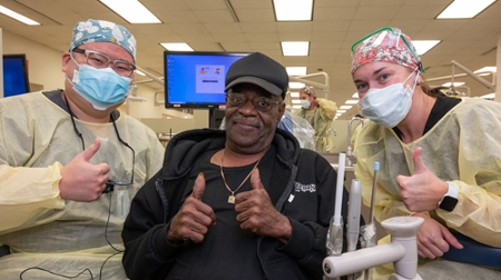 Photo: Veteran Marine John W. Smith receives free dental care provided by SIU SDM students.