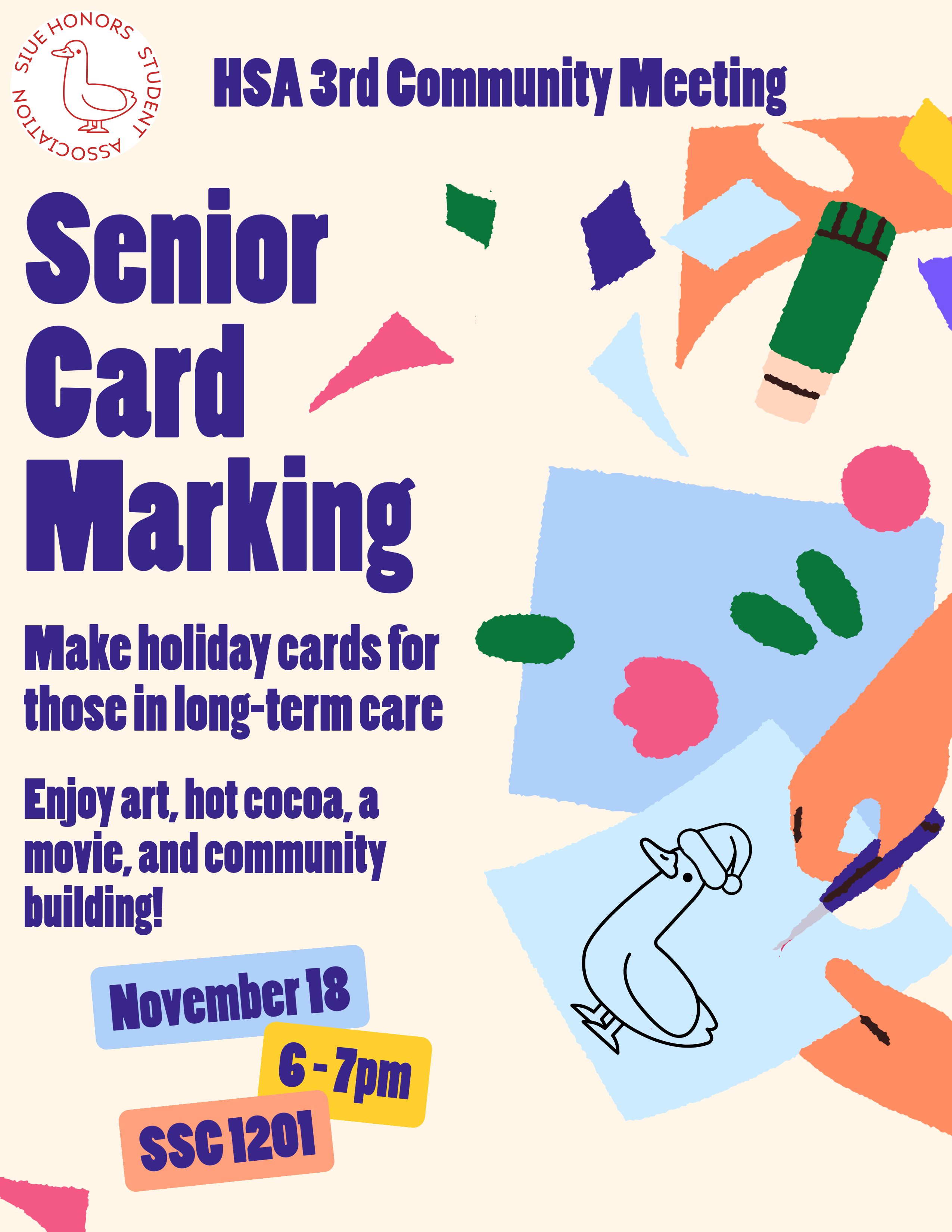 Needing service hours? Feeling the urge to craft? You're in luck! HSA's 3rd community meeting is also a service opportunity! Tomorrow, November 18th, 6-8 pm, (So plenty of time for Life of the Mind first!) come make cards for senior citizens, while also watching the movie you all voted for on Instagram (@siuehsa) and drinking hot chocolate! While basic crafting supplies will be provided, feel free to bring more fun stuff—like stickers, stamps, etc.!
