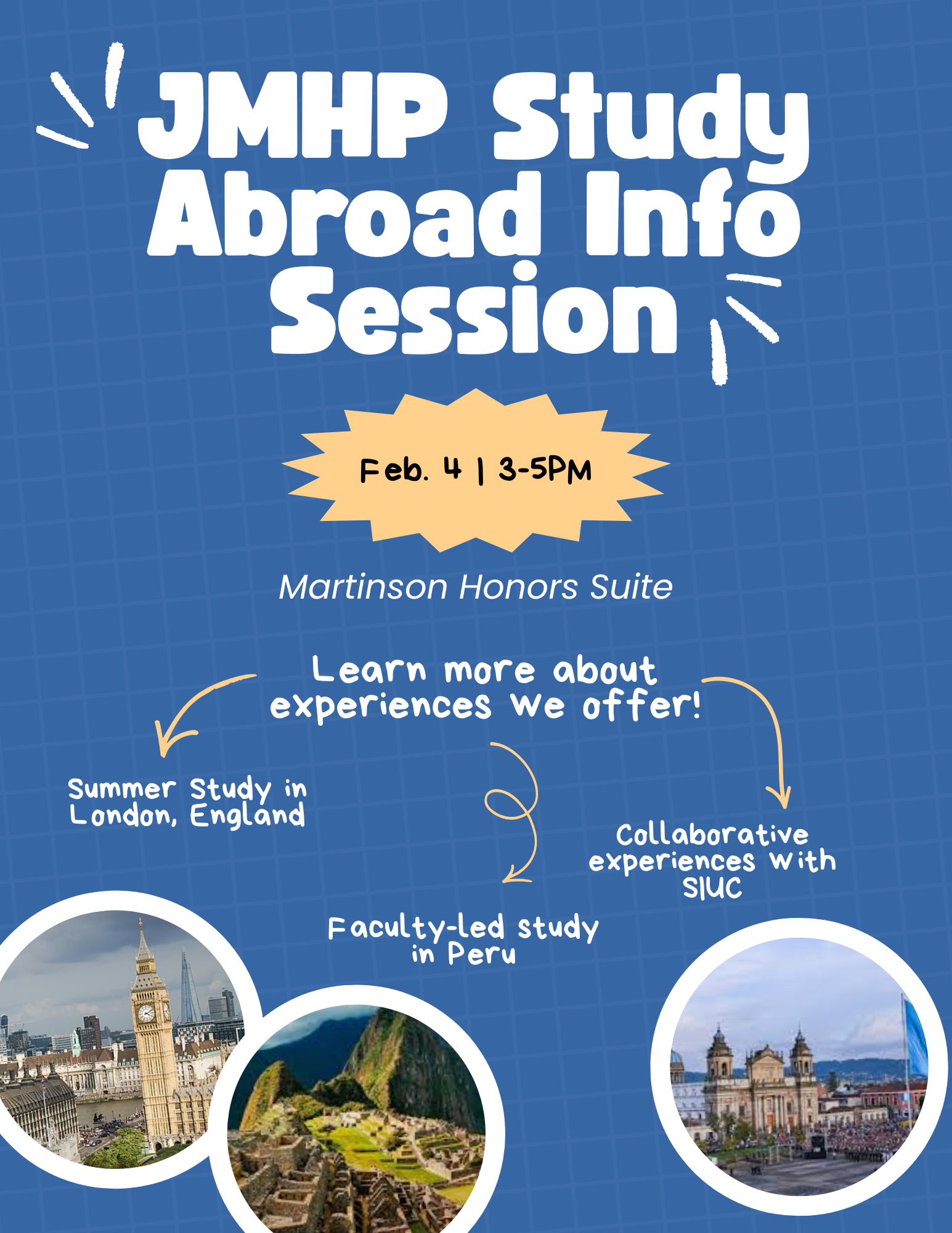 We've got another busy week as we get ready for Honors Scholarship Day, but don't forget to attend the Study Abroad Info session tomorrow from 3-5 in the Martinson Honors Suite. International travel, fabulous places, beautiful experiences, and lasting impressions, what could be a better way to earn a few honors credits?