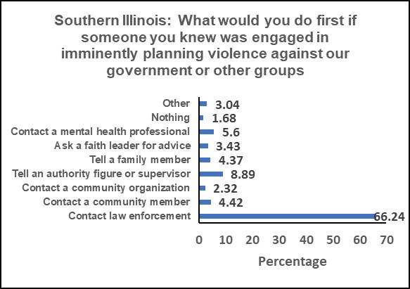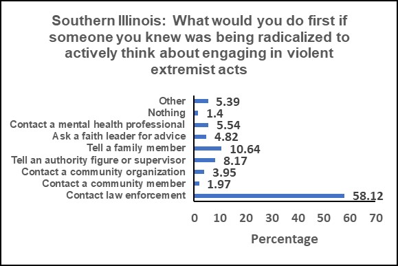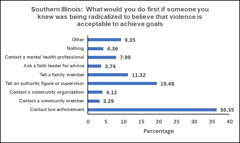Among those who told us they would know what to do if someone was being radicalized in their views, a plurality in Southern Illinois said they would contact law enforcement first, with the next most common answer being tell a family member. Nationally this order is reversed.