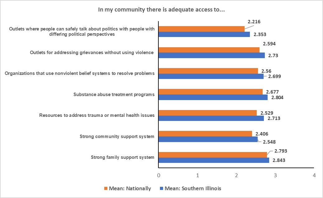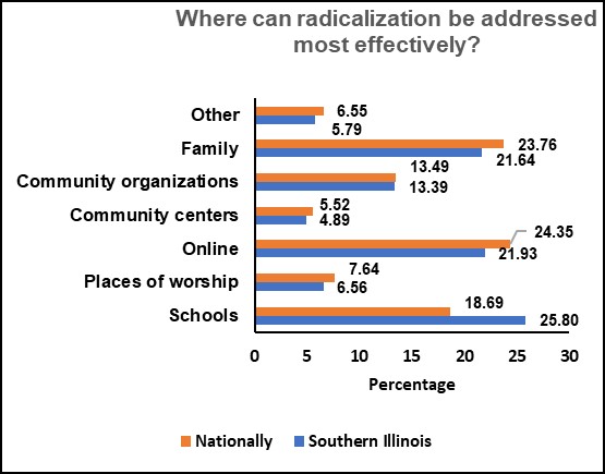 Americans express support for addressing radicalization through a variety of venues. Nationally, online is the most common answer to where people think radicalization can be addressed most effectively, followed by family and schools, whereas in Southern Illinois the most common answer is schools followed by online and family. These answers provide support for the importance of taking a whole of society approach to the prevention of targeted violence and terrorism. Yet, people’s answers to where radicalization can be addressed most effectively and what they would do first at various stages of radicalization to violence may also be influenced by the availability of resources in their communities. With means for adequate community access to resources ranging between neither agree nor disagree and agree, there is clear need for investment in a variety of community resources relevant for prevention.