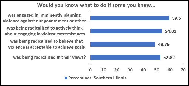 Despite this concern over radicalization and the potential for targeted or political violence or terrorism, most Americans, including most Southern Illinoisans, express uncertainty over what they should do if someone they knew was being radicalized.