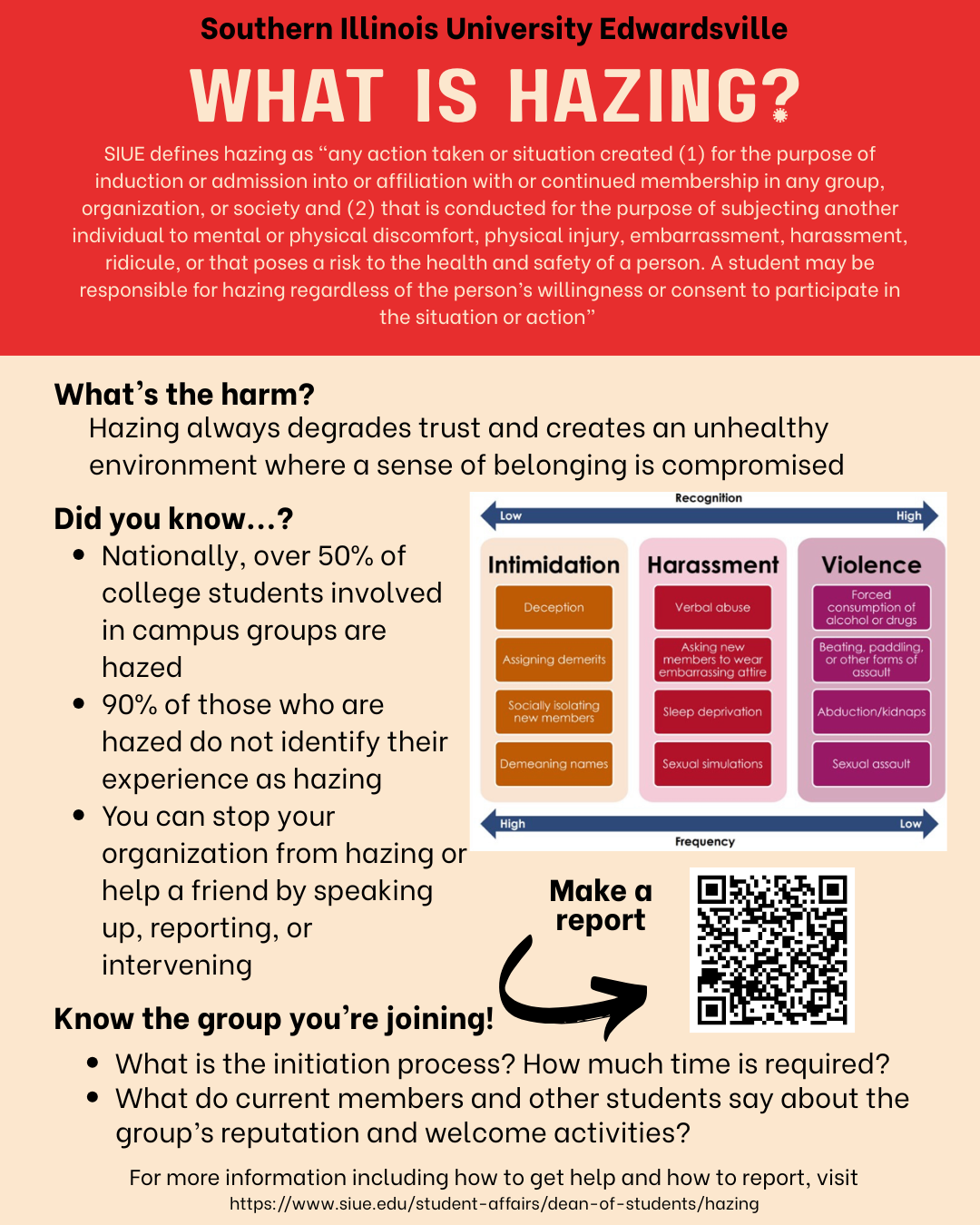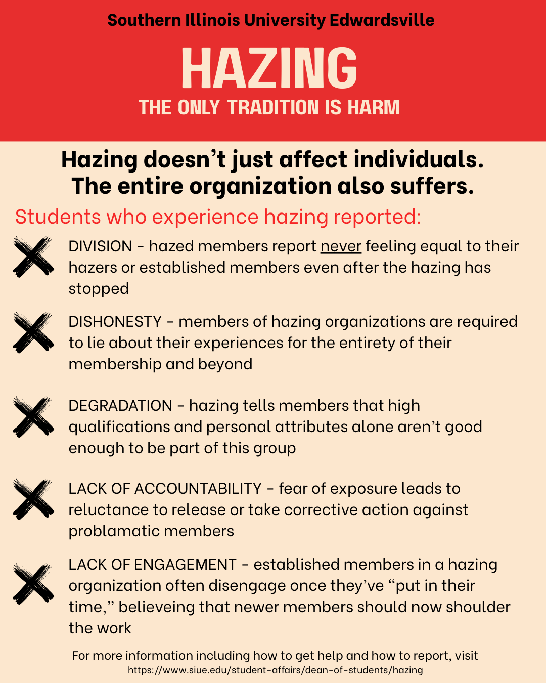 Southern Illinois University Edwardsville is committed to providing a safe educational environment for everyone and does not tolerate hazing by any group or individual affiliated with the University.